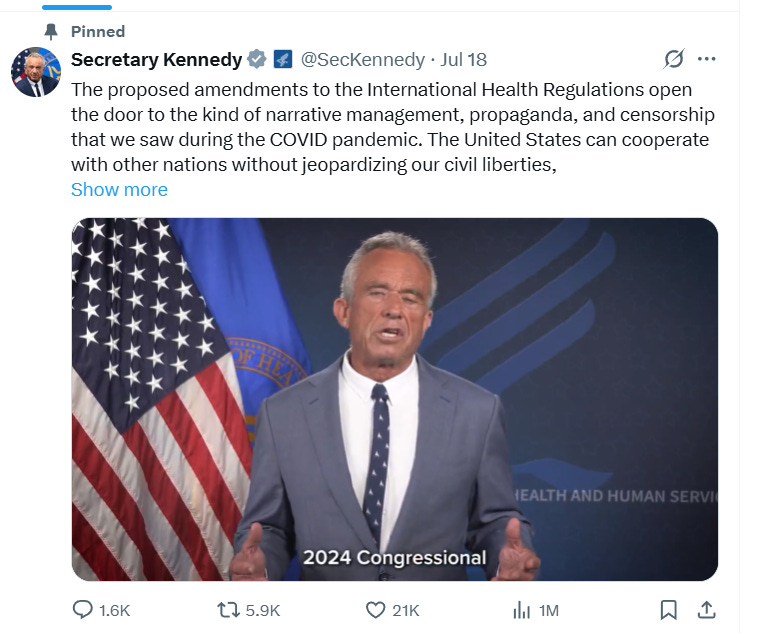With a great sense of celebration, and, yes, relief, the United States rejected the proposed amendments of the IHR by the July 19th deadline. Take a listen to what Secretary Kennedy had to say: