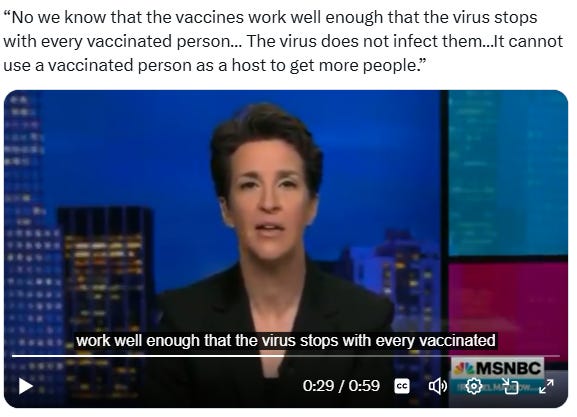 One could argue that the products are FRAUDULENT. They do not do what the pharmaceutical companies (or the federal government at the time) claim they do: they neither stop transmission nor infection. In fact, this peer-reviewed study shows those who are “up to date” on their Covid vaccinations have a higher risk of covid infection than those “not up to date.” Here’s another study. And there are hundreds more studies corroborating these findings. This runs in complete opposition to the aggressive PR campaign blanketing the entire world during the pandemic and continues to this day. An example from Rachel Maddow, MSNBC: