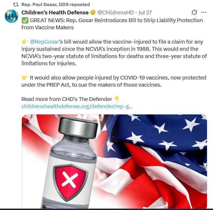 There is a fantastic bill in Congress now that we fully endorse — Rep. Gosar, AZ, introduced HR 4668, a bill to strip vaccine manufacturers of their unjust liability shields.